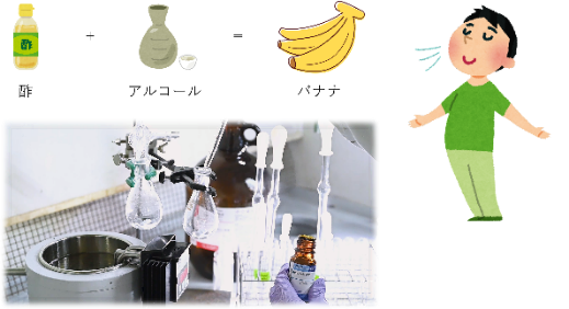 よく熟れたフルーツは,いい香りがします。その香りの成分は,エステルという構造を持つ有機化合物です。この体験実験では,フルーツや清涼剤の香りを持つ有機化合物の合成を行います。例えば,バナナの香りの成分は,酢酸(お酢の主成分)とアルコール(お酒の仲間)から合成できます。