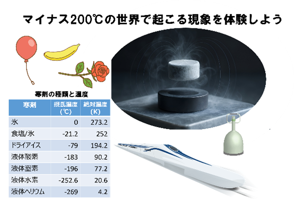 液体窒素は絶対温度77 K (摂氏-196℃)の非常に冷たい液体です。液体窒素の極寒の世界ではどのような現象が起こるのかを、皆さんと一緒に体験してみましょう。そして、冷却すると電気抵抗がゼロになる物質、超伝導体に磁石を近づけると何か起こるかを観察します。