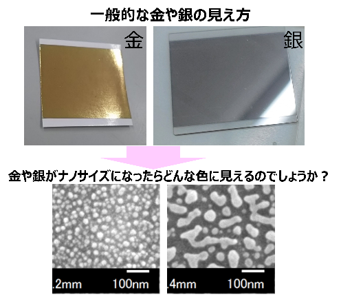 金色や銀色と聞くと、通常は光沢のある「金」や「銀」の色を思い出すのではないでしょうか?しかし、「金」や「銀」もそのサイズがナノメートルの領域に入ってくると、様子が変わってきます。実際にナノサイズの金属を作って色を観察してみましょう。