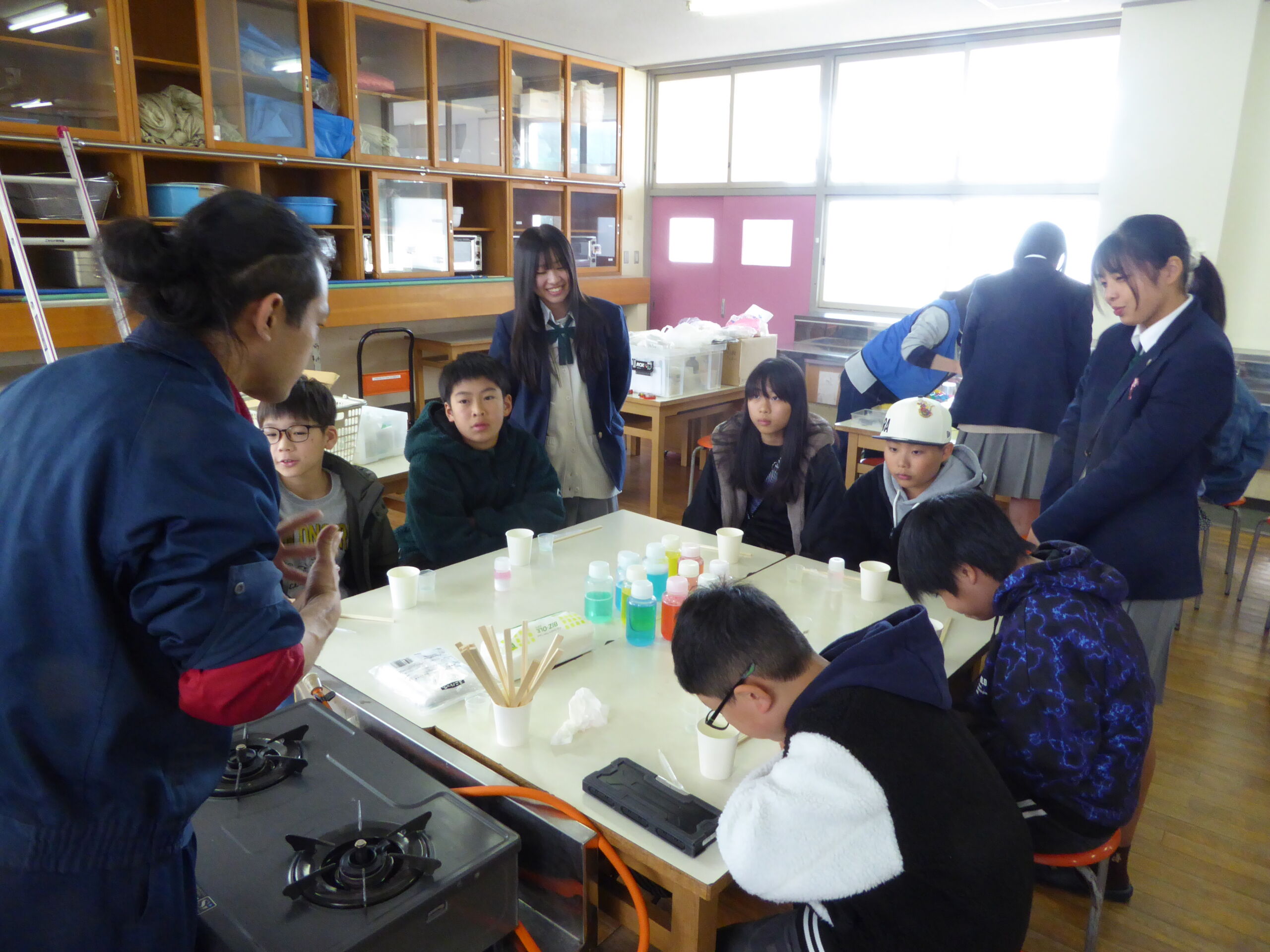同部から「ペットボトルで万華鏡を作ろう!」「クロマトアートでしおりを作ろう!」「入浴剤を作ろう!」「冷え冷えスライムを作ろう」の4テーマを出展し、18人の参加者がそれぞれのテーマを順番に回り全てのテーマを体験しました。また岡山城東高校の生徒7人がボランティアで出前実験に協力してくれ、参加者が安全に科学実験を行えるよう補助しました。参加した子ども達は、身近な科学に驚いたり喜んだりしながら、友達と一緒に工夫して取り組んでいました。