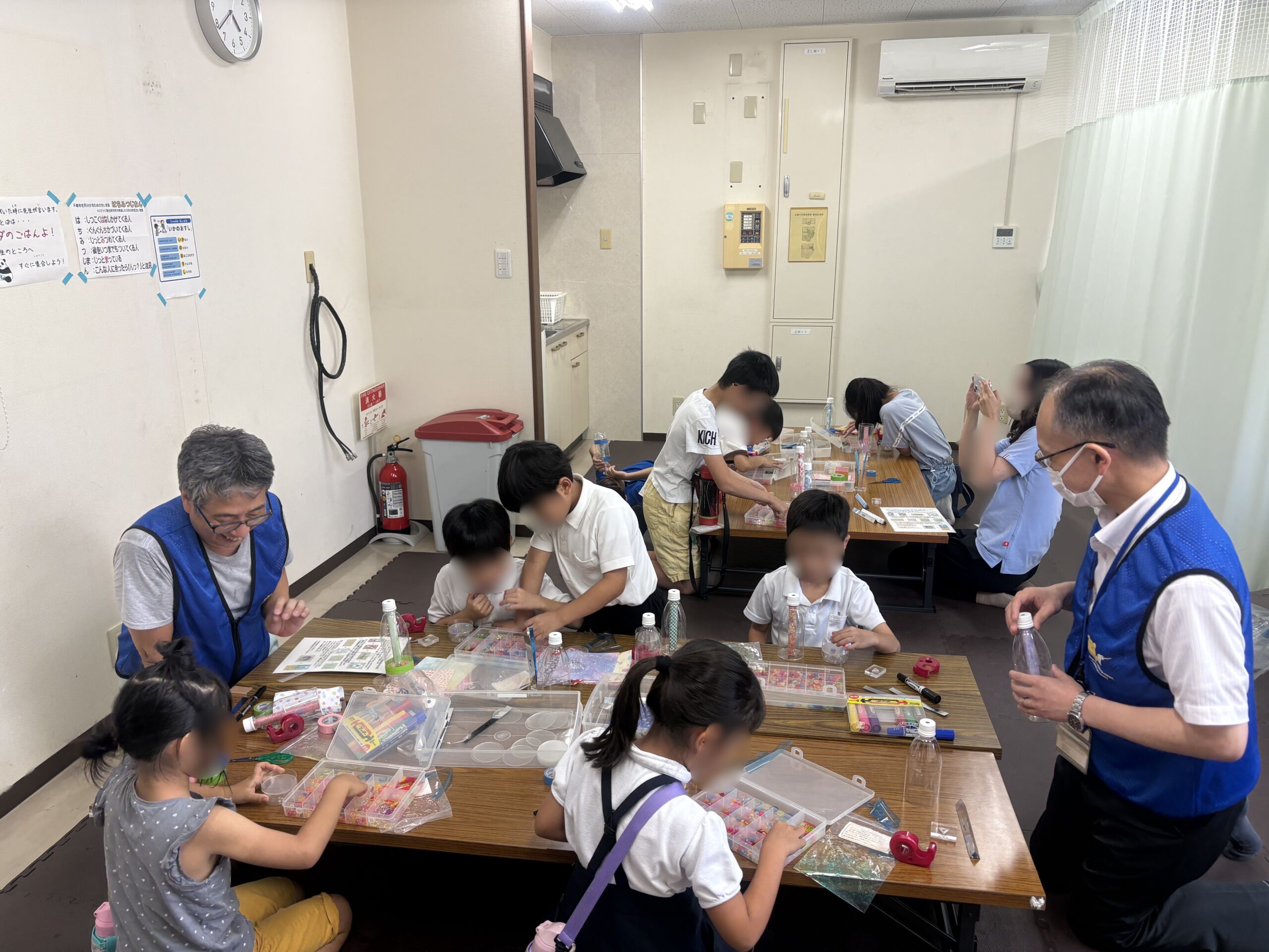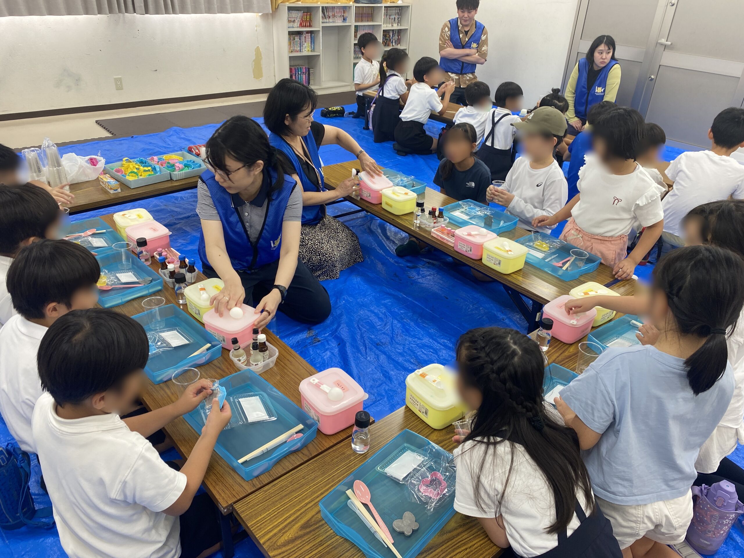 事前に申し込みがあった朝日こどもクラブ伊島本校に通う小学生42人が参加し、「ペットボトル万華鏡を作ろう」、「スライムで遊ぼう」、「入浴剤を作ろう」の3つのテーマを、グループに分かれて順番に体験しました。