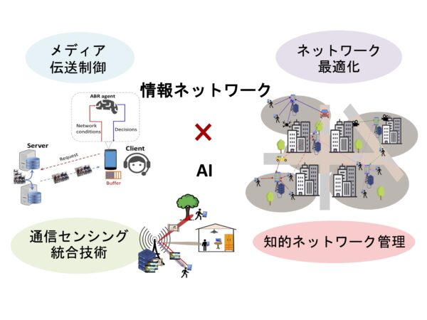 適応映像配信、通信センシング統合、および知的ネットワーク管理に関する研究に取り組んでいます。多数のユーザが接続するネットワークにおいて、高速かつ安定したデータ通信環境をどのように提供するかは重要な課題です。本研究室では、通信信号を利活用し、通信と同時に位置や速度のセンシングを行う「通信センシング統合技術」を開発することで、安心・安全で信頼性の高い知的ネットワーク管理技術の実現を目指しています。