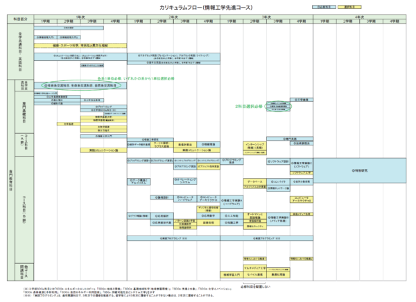 コース科目で情報工学の基礎知識を習得し、構造的なプログラミング能力の習熟を図ります。