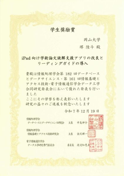 堺陸斗, 金澤輝一, 上野史, 太田学, iPad向け学術論文読解支援アプリの改良とリーディングガイドの導入, 信学技報, vol. 125, no. 307, DE2025-24, pp. 5-10, 2025年12月.