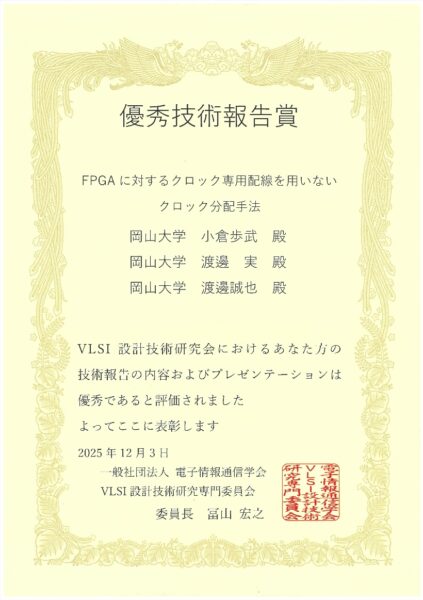 小倉歩武,渡邊 実,渡邊誠也,“FPGAに対するクロック専用配線を用いないクロック分配手法,” 電子情報通信学会VLSI設計技術研究会技術研究報告, Vol.124, No.329, VLD2024-101, pp.140–144, Jan. 2025.