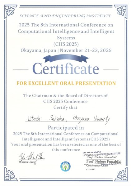 関岡空己さん(渡邊研院生)が 2025年11月21日〜23日に開催された 2025 The 8th International Conference on Computational Intelligence and Intelligent Systems (CIIS 2025) において Best session presentation award を受賞しました.