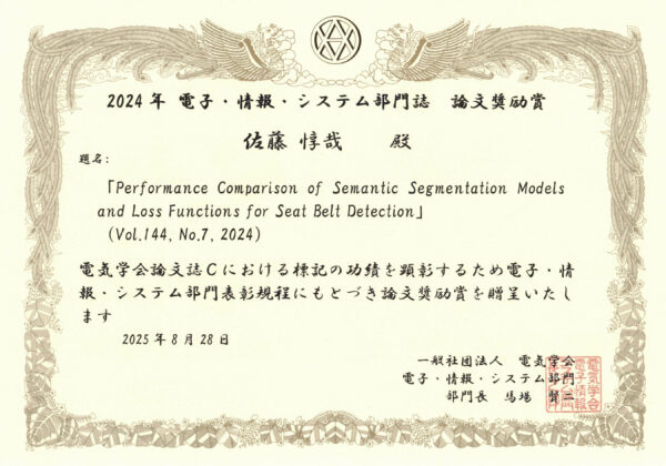 佐藤惇哉さん(明石研OB)が、電気学会論文誌Cにおいて2024年電子・情報・システム部門誌 論文奨励賞を受賞しました。